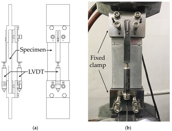Figure 3 shows the pull-out test setup. Tensile stress was applied to the specimen through iron clamps fixed at both ends of the specimen. The inner surface of the clamp was roughened to prevent slip between the specimen and the clamp. Linear variable displacement transformers (LVDTs) were installed on both sides of the center of the specimen to measure the opening displacement between the upper and lower parts of the specimen under the tensile load, which is representative of the pull-out displacement of the coated carbon-fiber textile reinforcement. The pull-out test was conducted under displacement control at a speed of 1 mm/min, and the applied load and LVDT displacement were measured and recorded every second.