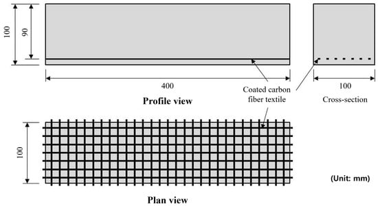 To analyze the reinforcement effect of the coated carbon-fiber textile on the structural behavior of the TRM beam, a four-point bending test was performed in accordance with ASTM C1609/C1609M [] to measure the load–deflection behavior. Accordingly, 100 × 100 × 400 mm3 specimens were prepared for the test. The layer of textile mesh was embedded such that rovings were arranged in the length and width directions of the specimen at a height of 10 mm from the bottom of the specimen. As with the pull-out specimen, the edge of the textile mesh was fixed to the mold in advance, and care was taken to avoid applying prestress to the textile mesh during fixing. The TRM specimens were demolded 24 h after casting, followed by curing in water for 28 days at 20 ± 0.5 °C.
