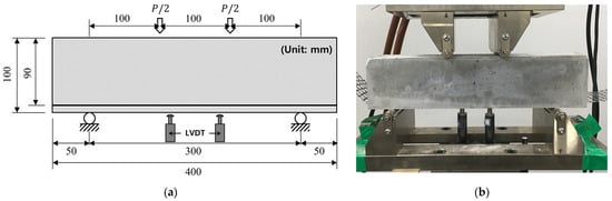 Figure 4 and Figure 5 show the geometry of the test specimen and the experimental setup for the four-point bending test. The length of the clear span was 300 mm, and the load was applied under displacement control at a speed of 0.2 mm/min at the two trisection points between the clear span. Because the LVDT was installed in the center of the lower surface of the specimen, the deflection measured during the test corresponded to that at this position. The applied load and deflection were measured and recorded every second using a data logger.