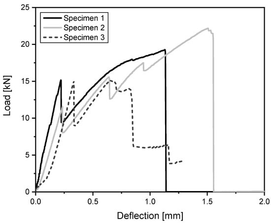 Figure 8 shows the load–deflection behavior measured through the four-point bending tests conducted on the TRM specimens. Noticeably, the deflection increased proportionally with the load increase at the beginning of the experiment. When the load reached 12–15 kN, dominant flexural cracks occurred at the bottom center of the beam specimens. Meanwhile, as flexural cracks occurred, the loads decreased to some extent due to the loss of tensile stress in the mortar beams but gradually increased due to the bond behavior of the textile reinforcement across the cracks during the subsequent pull-out process. Thereafter, the crack width increased, and the crack gradually propagated to the top of the specimen as the deflection and load increased. Most specimens were confirmed to be incapable of bearing load after peak load was reached, as shown in Figure 8. This is attributable to the occurrence of brittle fracture after the fibers exposed to the cracks raptured. The maximum loads at the fracture of the specimens were 15.1–22.2 kN. Although the maximum loads varied, the general load–deflection responses before fracture in all specimens were roughly similar. The flexural load in one specimen gradually decreased after the maximum load was reached, in contrast to the behavior of other specimens, where the bending test ended immediately after the maximum load was reached. Presumably, the fiber rovings of textile exposed to the crack ruptured gradually rather than suddenly as the load increased; hence, the observation in the former specimen.