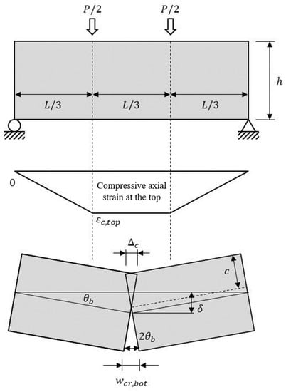 During the four-point bending test, the TRM beams eventually fractured as the dominant crack formed at the bottom center gradually propagated. When a beam fractures due to one dominant flexural crack, the flexural behavior can be briefly analyzed by idealizing the deformation and failure modes of the flexural member, as shown in Figure 9 [,,].