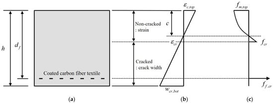 Figure 10 shows the stress–strain distribution in the cross-section of the cracked TRM beam. From the relationship in Equation (5), the strain and crack width distributions along the cross-section depth at the cracks can be expressed, as shown in Figure 10b. In the noncracked section, the compressive stress of the cement mortar is distributed for a given strain. On the other hand, the tensile stress in the cracked section caused by the cement mortar is zero, and only the tensile stress caused by the coated carbon-fiber textile reinforcement exists, as shown in Figure 10c.