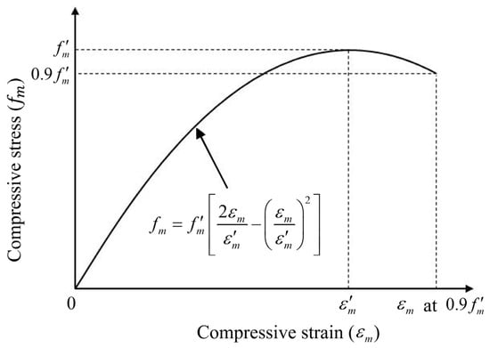 Figure 11 shows the compressive stress–strain relationship in the noncracked section, which is determined from the relation proposed in a previous study []. The parabolic part of the curve can be calculated from Equation (9), which is valid until the stress reaches 0.9 in the descending part.