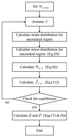 Figure 13 shows the analysis algorithm based on the above description for a mortar beam reinforced with coated carbon-fiber textile. First, the flexural crack width at the bottom of the beam () was set, and the neutral axis position of the cross-section with the set crack width () was assumed. Accordingly, the strain distribution of the section was calculated. From the calculated strain distribution, the compressive stress of the cement mortar and the tensile stress of the coated carbon-fiber textile reinforcement () in the cracked section can be calculated, and the validity of the assumed neutral axis position can be verified through the equilibrium condition of the forces within the cross-section, as shown in Figure 13. The neutral axis position that satisfies the equilibrium condition within the cross-section can then be determined iteratively, and the sectional moment () and the applied load () to the beam can then be calculated. Finally, by calculating the deflection at the center of the beam for a given crack width (), the load–deflection curve of the TRM beam can be predicted.