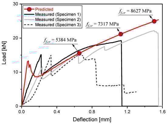 As shown in Figure 8 and Figure 14, despite the specimens being replicated, variations between the experimentally measured load and deflection values for the TRM failure beam were present. This is attributed to all the textile rovings exposed to the crack not rupturing simultaneously; rather, they ruptured sequentially from the weakest roving, which affected the flexural properties (strength, toughness, etc.) of the TRM beam. In addition, differences in the material properties, such as the tensile strength of each textile or variation in the bond of each roving with the matrix among the load-aligned textile rovings, may have been present. Therefore, for a more detailed analysis, the tensile strength of the textile reinforcement exposed to the crack was predicted through theoretical analysis by utilizing the deflection value at the maximum load for each specimen measured in the actual bending test. The predicted values are shown as red circles in Figure 14. The evaluated tensile strengths were confirmed to have exceeded 4300 MPa, which corresponded to the strength of the textile roving provided by the manufacturer (Table 2). This indicates that using textiles is advantageous in terms of tensile strength as compared to using individual fibers. However, the tensile strength of the fiber may be uncertain, because the material properties of fibers are generally provided conservatively by manufacturers. The tensile strength of the used textile reinforcement in the cracked section is considered to be at least more than 5384 MPa, as shown in Figure 14.
