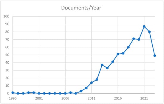 Document distribution over the years of the global trend in climate adaptation publications from 1996 to 2023, reflecting increased awareness and attention starting around 2010.
