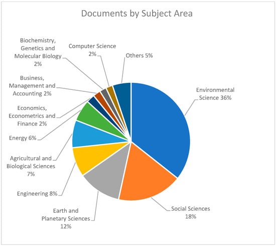 In analyzing the subject area of the documents, Environmental Science dominates with 491 documents, reflecting the direct impact of climate change on the environment. Social Sciences, with 240 documents, and Earth and Planetary Sciences, with 163 documents, also contribute significantly. It is encouraging to see a broad interdisciplinary interest, with contributions from Engineering, Agricultural and Biological Sciences, Energy, and Economics. The diversity of the subject areas involved underlines the complex and interdisciplinary nature of climate change adaptation measures [16]; See Figure 2.