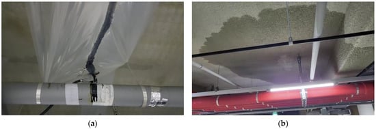 Despite the operation of the above system, the number of disputes and lawsuits related to leakage defects in apartment buildings has been increasing every year. Especially in large underground parking lots, which are becoming more important due to their size and space [,,], the lack of guidelines and post-treatment measures for leakage defects exacerbate the issue of underground space leakage [,]. The upper part of the top floor of underground spaces in apartment buildings, in particular, experiences high vibration or movement due to vehicle passage, making it susceptible to rainwater intrusion and leaks caused by cracks [,]. Additionally, the top floor of underground parking lots is constantly damaged not only by leaks due to defects in the waterproof layer of the upper slab, but also by issues like soil or gravel weight causing leakage [,] (See Figure 1). Therefore, there is an urgent need for laws, institutional leak prevention devices, and guidelines for underground spaces in apartments in Korea [,].