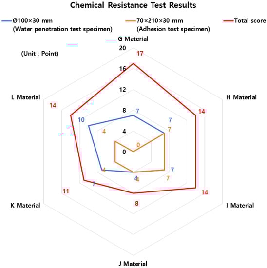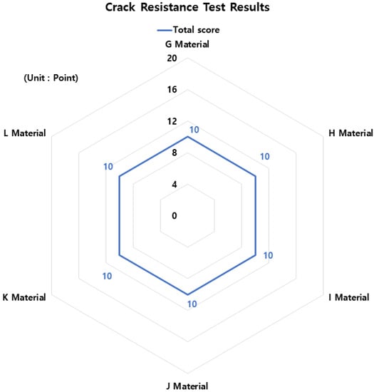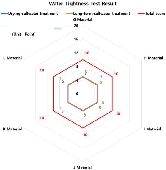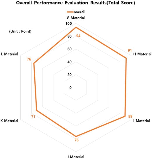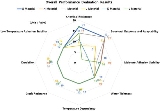 The comprehensive results of the KCS 11 44 00: 2018 “Joint District” performance evaluation are shown in Table 6, and Figure 16 and Figure 17 below. According to the overall results of the performance evaluation, material G (composite waterproofing method (adhesive flexible seal material + improved asphalt waterproofing sheet)) was given 94 points out of 100 points and material H (composite waterproofing method (urethane coating waterproofing + improved asphalt sheet waterproofing)) was given 91 points. Material I (self-adhesive waterproof sheet (rubber asphalt or butyl rubber)) was given 89 points, and material J (improved asphalt water-proof sheet (rubber asphalt)) and material L (coating waterproof material (rubber asphalt or urethane rubber)) were given 76 points. Lastly, material E (synthetic polymer waterproof sheet (vinyl chloride resin)) was confirmed to have a score of 71.