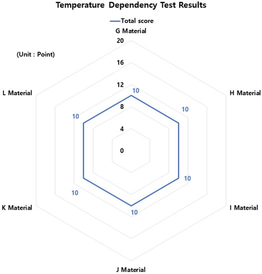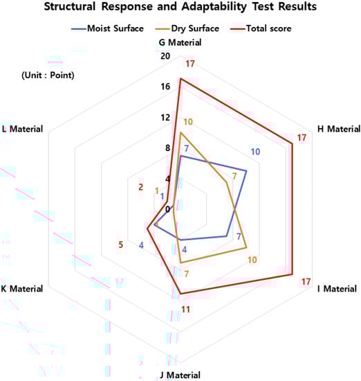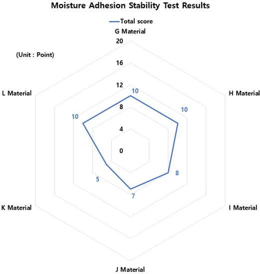 Figure 7 shows the test results for Moisture Adhesion Stability. As a result of the Moisture Adhesion Stability test, materials G, H, and L were identified as having 10 points because there was no abnormality in the test piece under all conditions, and material I was identified as having 8 points due to floating in freezing melting and cold and hot repeatedly. In addition, material J was identified as having 7 points due to the occurrence of excitation in wet, frozen melting, and cold and hot repetition, and material K was identified as having 5 points due to excitation in all tests except for the dry surface.