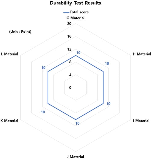 The test results for durability are shown in Table 5 and Figure 13. As a result of the durability test, all materials were found to have 10 points because they satisfied all of the quality standard items.