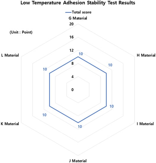 The test results for the stability of low-temperature adhesion are shown in Figure 14 and Figure 15. As a result of the low-temperature adhesion stability test, all materials were confirmed to have 10 points because no pitcher was generated in the test piece under all conditions.