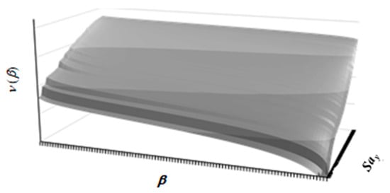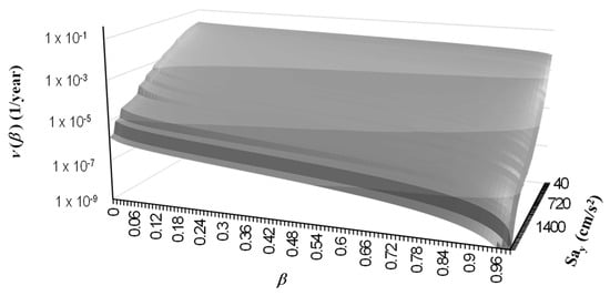 By repeating the previous steps for all of the considered lateral strengths, , but keeping constant the vibration period, T, it is possible to obtain a 3D surface that represents the relationship among loss, lateral strength, and exceedance rate of loss. Figure 9 shows an example of the 3D surface β-ν(β)- for a family of SDOF with T = 2.2 s.
