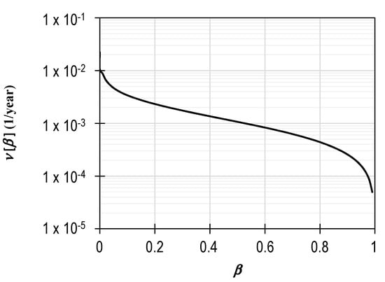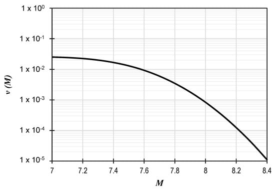 In this example, for the sake of simplicity, only earthquakes generated from one seismic source were considered. Such seismic source is the Guerrero Gap, one of the most studied seismic zones by seismologist and civil engineers [,]. The earthquake generation model for the subduction zone of Guerrero is described using a characteristic earthquake model [], whose parameters are T00 = 80 years, Mo = 7.0, Mu = 8.4, D = 7.5, F = 0, σM = 0.027, and To = 39.7 years [,]. Figure 3 shows the estimated exceedance rate of magnitudes curve for the Guerrero Gap.