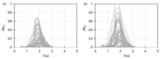 Figure 4 presents the estimated nonlinear responses as damage spectra using a post-yielding rate of α = 0.05 [], where, for each spectrum, all SDOFs have the same lateral strength. It is observed that the damage indexes have a large variability, mainly because of each seismic record’s characteristics, such as intensities, frequency, and duration; this variability is considered in the computation of the probability of loss.