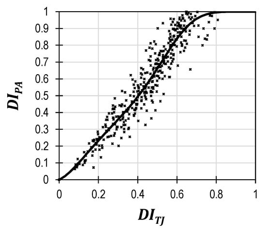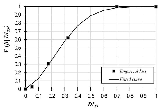 By relating the data provided in Table 2, it is possible to fit a curve of the physical damage (DITJ)—structural loss ratio (β) for conventional RC structures. Figure 6 shows a fitted curve obtained through nonlinear regressions (Equation (2)); this curve was obtained by relating the midpoint of each DI interval and the corresponding loss ratio. In the same figure, it is possible to see that the physical characterization of damage does not have a linear relationship with the characterization of the economic loss. Reparation costs exhibit high variability; however, uncertainty between the repair cost and damage index was not considered in this study.