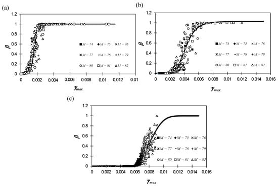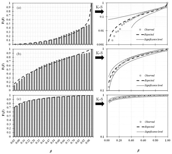 For estimating the exceedance probability of loss, the nonlinear responses in terms of loss of the SDOFs were catalogued according to the M and R of the seismic records; subsequently, a statistical analysis was performed with the purpose of fitting a probability distribution function (PDF). Kolmogorov–Smirnov tests were performed to assess the goodness of fit of several probability distributions. Accordingly, beta PDF was deemed the most adequate. Furthermore, this PDF is delimited between zero and one, which is consistent with the loss ratio values. Figure 7 shows three examples of the performed Kolmogorov–Smirnov test, where it is possible to see a good fit of the beta PDF (i.e., expected) (dashed line) to the statistical data (i.e., observed) (bars graphic) for a 5% significance level.