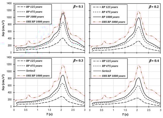 To build a uniform risk spectrum, it is necessary to compute a 3D surface (β-ν(β)-) for each considered vibration period. Subsequently, a couple of loss and an exceedance rate of loss values must be selected. According to the selected loss and exceedance rate of loss values, the corresponding lateral strength in each 3D surface (i.e., each vibration period) must be obtained. The URS is the spectra built with all of the lateral strengths of the considered vibration periods associated to the same loss and exceedance rate of loss. Figure 10 shows a comparison between the uniform hazard spectra (UHS) and URS for the analyzed site in terms of the return period (RP), i.e., the inverse of the exceedance rate. It can be readily seen that differences in the spectral ordinates for different values of loss and return period exist. For instance, for a constant value of β, the spectral ordinates were higher as the RP increased; on the other hand, if the RP was constant and β increased, the seismic demands decreased, i.e., the accepted risk was higher, and the required strength of the structure was lower.