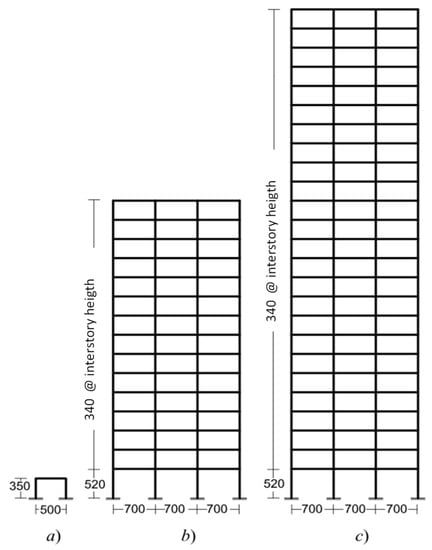 MRF: (a) single bay, single story; (b) three bays, fifteen stories; (c) three bays, twenty-five stories, dimensions in cm.