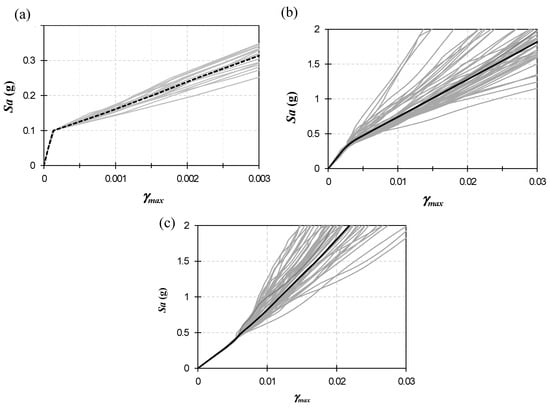 For estimating the seismic vulnerability of the analyzed structures, several incremental dynamic analyses (IDAs) [] were carried out. For this purpose, the same 550 seismic records, as described previously, were used. Figure 13 shows the estimated IDA curves in terms of the maximum inter-story drift (γmax) for each structure; the gray lines represent the IDA curves for each seismic record, and the black line represents the average curve.
