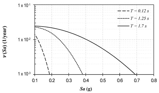 Upon defining the exceedance rate of the magnitudes of the analyzed seismic source and the exceedance probability of loss, it is possible to solve Equation (1). Figure 8 shows an example of an exceedance rate of loss computed with Equation (1) for an SDOF with T = 2.2 s and = 300 gals.