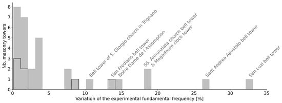 - The variability of the identified experimentally for the same historic tower. When available, most of the repeated OMA surveys highlight a discrepancy of up to 0.05 Hz. This difference is in the range of the contribution of tower features, inviting us to reduce in the uncertainties when evaluating both the fundamental frequency and the tower’s features;