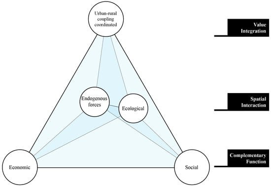 Currently, scholars generally agree that achieving integrated urban–rural development requires close coordination and cooperation between urban and rural areas. The goal of integrated urban–rural development can be accomplished through positive interactions, such as complementing each other’s roles, facilitating the movement of resources, and ensuring equal rights. However, the specific routes and strategies employed to achieve urban–rural coupling and coordinated development may vary across countries and regions due to differing circumstances. Several examples of urban–rural coordination and coupling can be observed, including the equalization model in Germany, the legislative-driven model in the United States, the transfer payment model in Canada, and the contemporary rural model in France []. Chinese scholars have devised a three-fold approach to integrated urban–rural development. Firstly, they rely on national policies such as new urbanization and rural revitalization strategies to establish a comprehensive framework for urban–rural integration, requiring collaborative efforts from both urban and rural regions [,]. Secondly, institutional reforms are emphasized to overcome the urban–rural divide and establish mechanisms that integrate urban and rural elements, thereby promoting positive interactions []. Lastly, a spatial planning system is constructed that takes into account land usage and promotes complementary urban–rural functions. This system recognizes the distinctive characteristics of urban–rural spatial development patterns, encompassing aspects such as production, lifestyle, and ecological spaces [,].