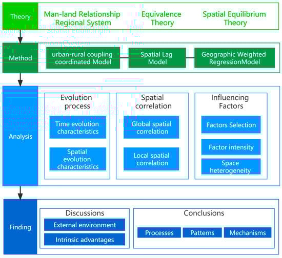 The global economy is currently experiencing significant transformations and adjustments. The recovery of the world economy is slow, and the COVID-19 pandemic has worsened the global economic downturn. Northeast China’s economy and society are confronted with numerous challenges, including the immense pressure of population decline and the widening gap between urban and rural areas. The reduction in population is a prominent feature of regions experiencing shrinkage. As a city goes through the process of shrinking, its development potential within the regional urban system declines either absolutely or relatively. This decline is evident in the outflow of development elements such as human capital, investment, factories, and businesses. Consequently, the city’s central role in development weakens, making it difficult to drive rural development and diminishing the interaction between urban and rural areas []. This exacerbates the deprivation of rural regions by urban areas. In response, rural regions must utilize their agricultural and ecological advantages to achieve complementary urban–rural functions and gradually narrow the urban–rural gap. This approach may foster a higher level of integration between urban and rural areas. The research framework presented in Figure 2 of this paper aims to address the following questions: (1) How does population decline impact the coupling and coordinated development between urban and rural areas in Northeast China? (2) What changes occur in the spatial correlation characteristics of the coupling and coordinated development between urban and rural areas in Northeast China? (3) What factors influence the coupling and coordinated development between urban and rural areas in Northeast China, and to what extent do they contribute under the context of population shrinkage? To answer these questions, we analyzed the growth of urban and rural regions in Northeast China, considering the impact of population decline, using a standard framework for geographical research that encompasses processes, patterns, and mechanisms.