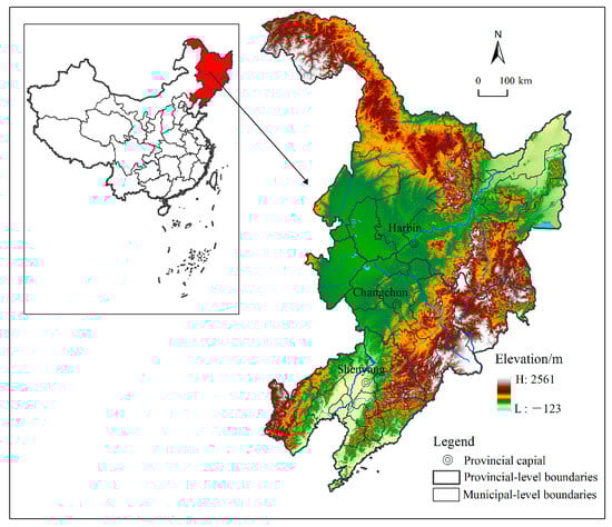 Northeast China, situated in the northeastern part of China, possesses fertile land and abundant forest and mineral resources (Figure 3). It serves as a significant heavy industry and agricultural hub in China, playing a crucial role in ensuring national defense security, food security, ecological preservation, and industrial stability. As a distinct economic and geographical entity, Northeast China has undergone its own distinctive historical development. Following the establishment of the People’s Republic of China, it emerged as a vital center for heavy industries, commodity grain production, energy production, and forestry, making substantial contributions to the country’s economic progress. However, since the advent of economic reforms and opening up, the region has experienced a significant deceleration in economic growth, becoming one of the pressing challenges in China’s regional economic development. The changes in population within Northeast China have closely paralleled its economic growth. Between 2000 and 2020, the total population of the region witnessed two distinct phases: A period of slow growth, followed by a period of rapid decline. From 2000 to 2010, the population increased from 106.55 million to 109.51 million, exhibiting a growth rate of approximately 2.7% and an average annual increase of 296,000 individuals. However, during this period, the population of 11 cities in the region experienced a decline. Subsequently, from 2010 to 2020, a period of swift population decrease occurred, resulting in the region’s population dropping from 109.51 million to 98.51 million, reflecting a decrease rate of around 10% and an average annual decline of 1.1 million people. Only Shenyang, Dalian, and Changchun observed growth in their overall population. The population dynamics in Northeast China from 2000 to 2020 can be categorized as the initial stage of population shrinkage from 2000 to 2010, followed by a phase of comprehensive population decline from 2010 to 2020, based on the distinctive characteristics observed.