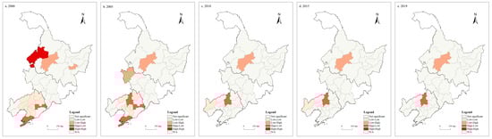 According to the analysis of the global Moran’s I index for urban–rural coupling and coordination (Table 4), the level of urban–rural coupling and coordination in 2000 demonstrated that cities with high values of this degree were located close to each other, while cities with low values were also spatially adjacent. However, from 2005 to 2019, Moran’s I index did not show any significant results (p > 0.1), suggesting the absence of a notable spatial correlation in urban–rural coupling and coordination in Northeast China. Moreover, Moran’s I index displayed a fluctuating downward pattern, indicating a gradual weakening of the integration and development of urban–rural areas in Northeast China due to a decline in population.