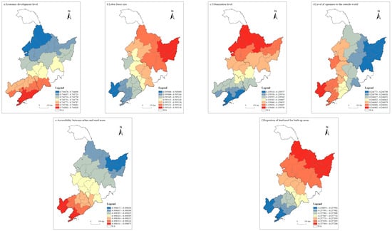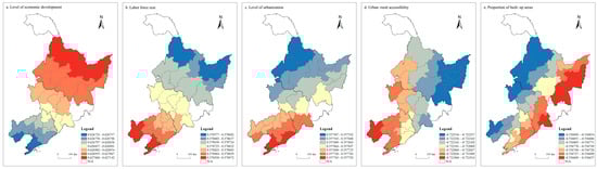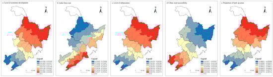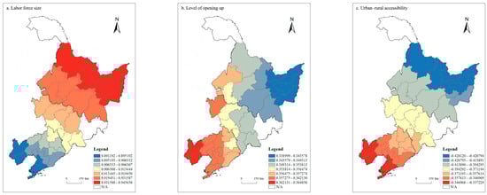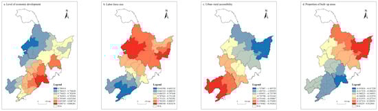 Spatial distribution maps of the changing impact of the influencing factors on the urban–rural coupling and coordination in 2010.