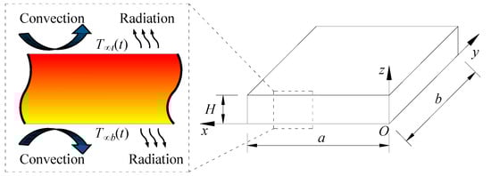 Figure 1 shows a simply supported rectangular plate in the Cartesian coordinate (, , and ). In the initial stress-free state, the temperature in the plate is uniform and denoted by . We assume that the plate is subjected to convection and radiation boundary conditions from the top and bottom surfaces by external heat sources with T-D temperatures and , respectively. For simplicity, we assume that the temperature only varies along the thickness direction.