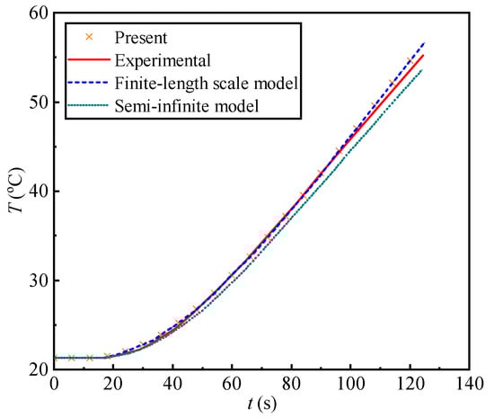 First, the comparison of the transient heat transfer behavior is carried out. Monds and McDonald [] built two mathematical models, namely, the finite-length scale model and semi-infinite model, to estimate the 1-D transient temperature in human skin during a simulated fire. The accuracy of the models was checked by comparison with the experimental results. In their work, the material properties and thickness of the skin simulant are the following: , , , and H = 19.66 mm. The temperatures at the top and bottom surfaces of the skin simulant are the following: and . Here, we use the present method to estimate the temperature variations at z = 11.12 mm and compare our results with the published ones []. The comparative results are shown in Figure 2. The present results match well with those of the finite-length scale model, but have a slight difference from the experimental ones when t > 100 s. The results of the semi-infinite model are more inaccurate compared with the present method and the finite-length scale model.
