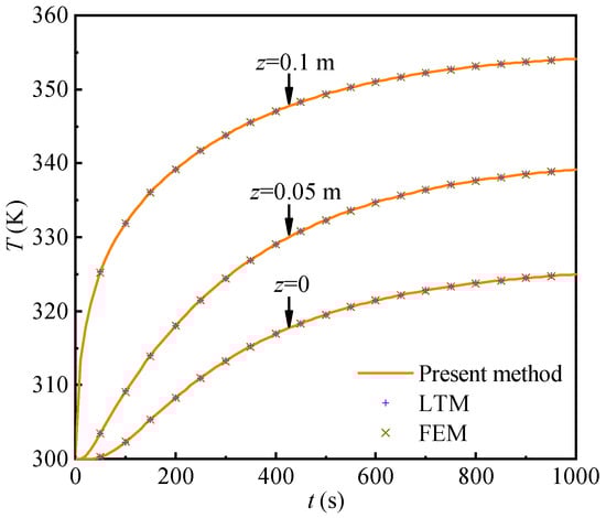 Figure 7 shows the time history of temperature at z = 0 and z = 0.1 m for different coefficients η = 0.005, η = 0.01, and η = 0.05. It can be seen that the present results using match well with the FEM ones. The temperature rises faster with η, since the top surrounding temperature rises faster with η (see Figure 6).