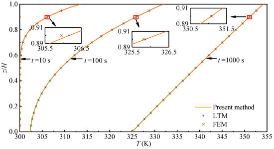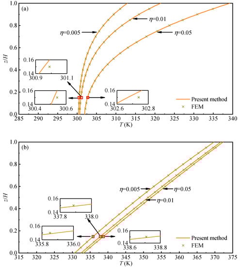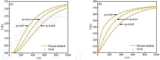 Figure 8 shows the temperature distributions at t = 100 s and t = 1000 s for different coefficients η = 0.005, η = 0.01, and η = 0.05. It is seen from Figure 8a,b that the temperature distributions are nonlinear at t = 100 s, but are nearly linear at t = 1000 s, which indicates that the temperature in the plate tends to be stable at about t = 1000 s. It is also noticed that, at t = 100 s, the FEM solution is less accurate with the increase in η; however, a similar phenomenon does not occur at t = 1000 s. This is because the temperature in the plate rises faster with η at the early stage, and tends to be stable at about t = 1000 s.