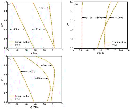 Figure 5 shows the through-thickness distributions of u, w, and at x = 0.2 m, y = 0.15 m for different times t = 10 s, t = 100 s, and t = 1000 s. It is seen that the displacement and stress distributions obtained from the present method and the FEM have a good agreement. Figure 5a–c show that the deformations and stresses are increased with time because the thermal load is increased with time. The displacements u and w vary slightly with the coordinate z at t = 10 s compared with those at t = 1000 s. Figure 5c shows that the distribution of changes from nonlinearity to linearity with time, which is similar to the variation of the temperature distribution.