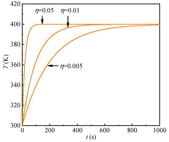 where the coefficient η represents the rate of temperature variation. Figure 6 shows the time history of for different coefficients η = 0.005, η = 0.01, and η = 0.05. In the following analysis, the interval of each time step is uniform and is taken as .