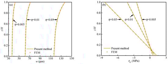 Figure 9 shows the through-thickness distributions of w and at x = 0.48 m, y = 0.48 m, and t = 100 s for different coefficients η = 0.005, η = 0.01, and η = 0.05. Figure 9a,b indicate that the maximum absolute values of w and are increased with η. The slopes of the curves of w and are both increased with η since the temperature gradient is increased with η (see Figure 8a). It is also noticed from Figure 9a that w is variable with the coordinate z. This demonstrates that the approximate 2-D plate theories, which assume that w is invariable through the thickness direction, may generate errors when estimating the thermomechanical responses of the plate.