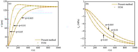 Figure 10 shows the time history of w and at x = 0.48 m, y = 0.48 m, and z = 0.05 m for different coefficients η = 0.005, η = 0.01, and η = 0.05. It is seen that w and increase quickly with η. It is also found that w increases quickly and tends to be stable after about t = 900 s; however, still has an obvious increase at t = 1000 s. Figure 10a indicates that the long-term deformations (i.e., deformations at t→∞) of the plate do not vary with η.