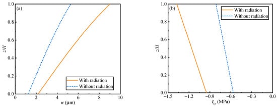 To show the effects of radiation heat transfer on the mechanical performance of the plate, two kinds of thermal boundaries are considered: (i) purely convection boundary and (ii) convection and radiation boundaries. Figure 11 shows the through-thickness distributions of w and at x = 0.48 m, y = 0.48 m, and t = 1000 s for η = 0.01. It is noted that to reduce convection effects, the heat convection coefficients of the top and bottom surfaces are taken as . It is seen that distributions of w and are greatly affected by radiation heat transfer. The values of w and with radiation effects are larger than those without radiation effects because radiation heat transfer will generate a larger thermal load.