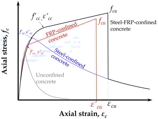 The confinement provided by the passive lateral pressure of both the steel and the carbon mesh is a function of their tensile strain, which results from the lateral expansion of the confined concrete. To account for the confining actions of both components, the model of [12] was adapted (see Figure 1). The original model is based on the assumption that the lateral strains of the transverse steel and of the FRP are equal [49]. Here, this assumption becomes redundant since the CFM is placed internally, at the same location as the transverse steel. The following text describes the main features of the axial stress–strain relations of a circular steel CFM laterally reinforced concrete column.
