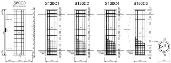 The test program was planned based on the model described above. A control specimen consisted only of transverse steel (without the CFM) with a transverse steel reinforcement volumetric ratio of 1.78%, provided by 10 mm steel ties, spaced at 80 mm. The other five specimen types with the hybrid reinforcement were designed (using the above-described model) to provide different confinement combinations, with lower amounts of transverse steel (than those provided in the control specimens) and the CFM with one, two, three, or four layers. At least two specimens of each type were tested (altogether 12 tests). The specimens are described in Figure 2 and the details of the specimens are presented in Table 2.