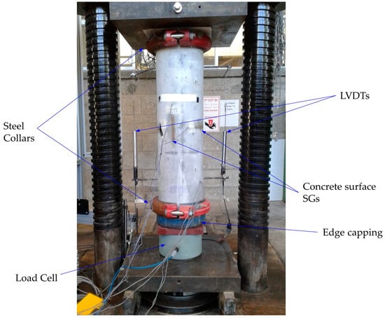 The structural and material properties of high-strength concrete (HSC) have been studied for several decades [1,2,3,4,5,6,7,8,9]. HSC is often used in high-rise buildings to reduce the cross-sectional area of columns and increase floor space. An important aspect of column design is the employment of confined concrete behavior at the ultimate limit state to allow the enhancement of both the column’s load bearing and deformation capacities. Enhanced deformation capacity is required even for braced columns not considered part of the seismic-force-resisting system which can be subjected to eccentric loads such as those developed in the event of an earthquake (e.g., [10]). The modeling of reinforced concrete (RC) column behavior is commonly based on their confined constitutive (stress–strain) relations [11,12,13,14,15,16,17]. For this reason, it is also important to understand the uniaxial behavior of confined RC columns.