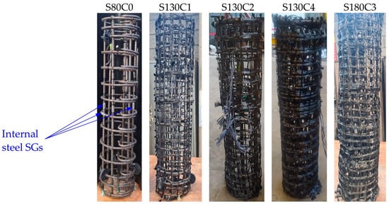 The axial load was measured using a 7.5 MN compression load cell. The deformations were measured using five external SGs (strain gauges) glued to the surface of the column, two in the lateral direction and three in the longitudinal direction (see Figure 3), and using four internal SGs bonded to each specimen’s steel reinforcement system—two on the longitudinal rebars and two on the ties, as shown in Figure 2 and Figure 4. All SG’s were placed at the mid-height point of the specimen. The global vertical deformation was measured using two LVDTs that were attached to the horizontal steel bars (before casting), extending on each side of the specimen (see Figure 2 and Figure 3).