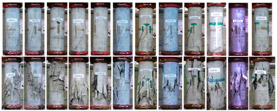 Maximal measured loads, the ratios between them and the unconfined nominal capacity () are presented in columns 2–3 of Table 3. The axial displacements and strains at the maximal (peak) load are presented in columns 4–5 of Table 3.