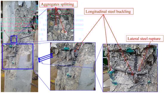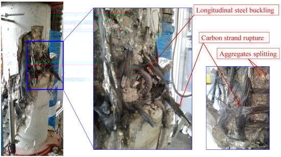 All specimens exhibited similar behavior, characterized by the spalling of the unconfined concrete cover, followed by the crushing of the concrete confined in the reinforcing cage. As shown in Figure 5, failure developed around the mid-height of the columns, and it was accompanied by local buckling of the longitudinal rebars (Figure 6). Furthermore, as shown in Figure 6 and Figure 7, the control specimens also exhibited rupture of their lateral ties, and similarly, full or partial rupture of their carbon strands was observed in the dually confined specimens. Thus, for the dually confined specimens, the test was terminated when the longitudinal steel buckled whereas for the control specimens this buckling was followed by the rupture of a steel tie and then the test ended. It can also be seen in Figure 6 and Figure 7 that concrete failure occurred due to the splitting of the aggregates, which is typical for HSC.