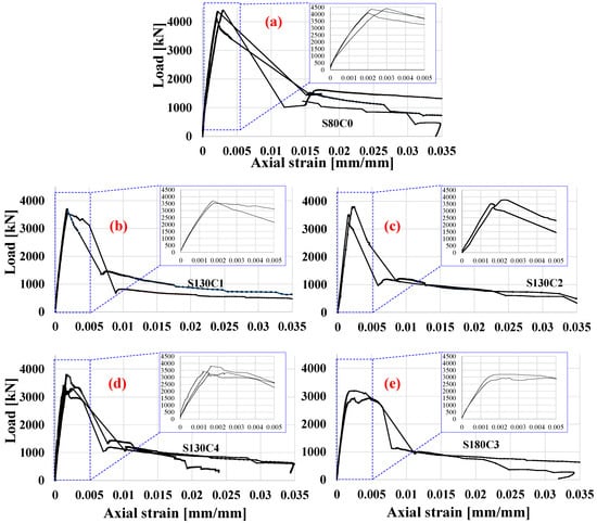 The axial load–strain curves as measured via the LVDTs are presented in Figure 8 for all specimens except for the two specimens of type S130C2. For these specimens, the LVDT results suffered from technical issues during spalling and therefore their load–strain curves were obtained from the DIC backup measurements and they are shown in Figure 8c.