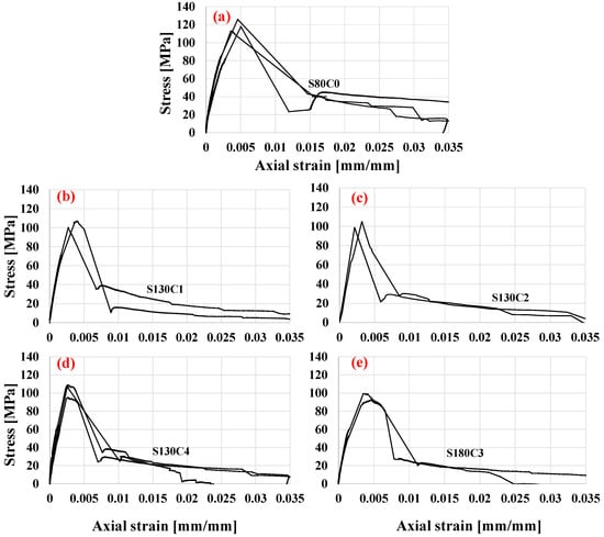 The results in terms of the columns’ stress–strain curves are presented in Figure 10. The figure shows that the application of the carbon-fiber meshes adds efficiency to the conventional rebar confinement (e.g., see S130C4’s higher peak-point than that of S130C2 in column 7 of Table 3). Yet, in the current tests the peak stresses obtained with the dual confinement system were ~15% lower than those of the control specimens that had dense confining steel ties (compare the peak of 126 MPa with that of 109 MPa in Table 3 for specimens S80C0a (control) and S130C4a (hybrid), respectively). The evaluation of the displacement capacity is discussed in the following section.