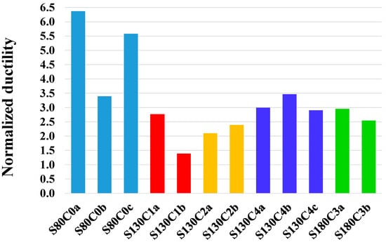 The ductility of the specimens was defined in this study by the area under the stress–strain curve up to a post-peak stress value of 20% of the peak, based on the curves presented in Park and Paulay [58] (who quote Kent and Park [59]) of concrete confined by ties. The areas under the stress–strain curves of all the specimens, normalized with respect to the analytical unconfined concrete ductility (calculated as 0.27 MPa), are presented in Figure 11. The figure shows that the control specimens with the high amount of lateral steel are the most ductile where the specimens with the hybrid confinement had lower ductility by about 40%. However, specimens with the largest amount of CFM (type S130C4) exhibited more ductile behavior than those with less CFM. These results show that for the specimens with the hybrid confinement system the higher the carbon fibers amount the larger the ductility improvement (see also average ductility values in Section 6.4). Yet, they also show that for the confinement transverse reinforcement and CFM amounts considered in this study, the hybrid system is less efficient in terms of ductility compared to the conventional reinforcement. It is also worth noting that the control specimens had a conventional volumetric lateral reinforcement ratio of ρs = 1.78% compared with only 0.79–1.10% in the specimens with CFM.