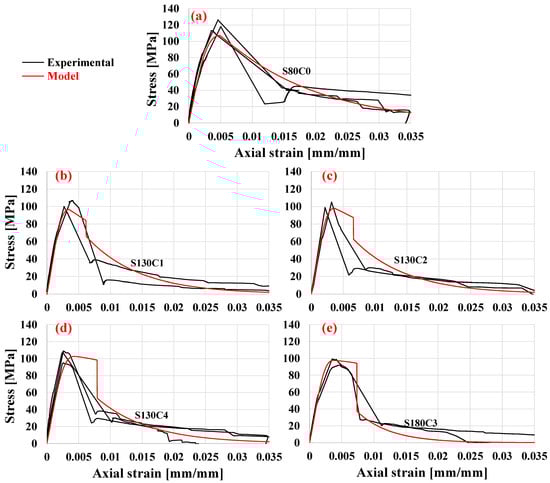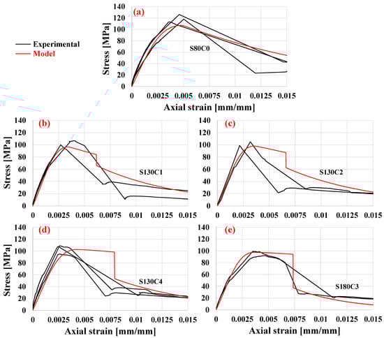 Comparison of the experimental and model stress–strain curves of specimens (a) S80C0, (b) S130C1, (c) S130C2, (d) S130C4, and (e) S180C3.